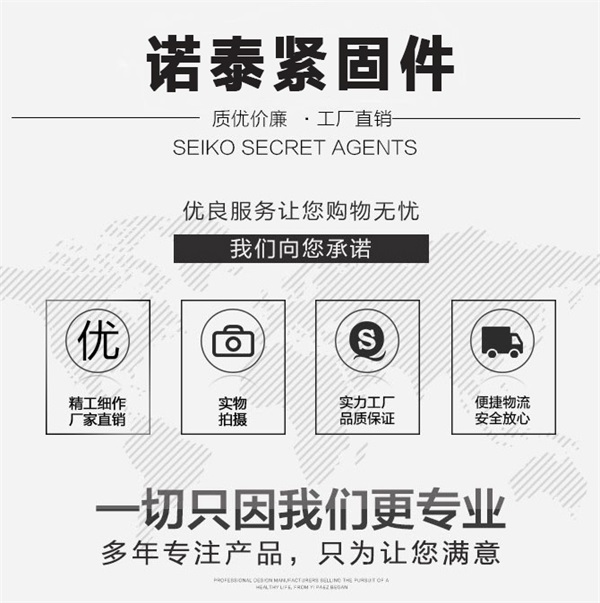 邯鄲市諾泰緊固件制造有限公司座落在中國緊固件制造基地--河北省邯鄲市永年區(qū),地處京廣線107國道、京珠高速公路和永河公路交匯處,地理位置優(yōu)越,交通十分便利。公司本著"以質(zhì)量求生存,以質(zhì)量求發(fā)展,向質(zhì)量要效益"的宗旨,以良好的品質(zhì)、貼心的服務(wù)和合理 的價(jià)格竭誠為廣大客戶提供服務(wù)。